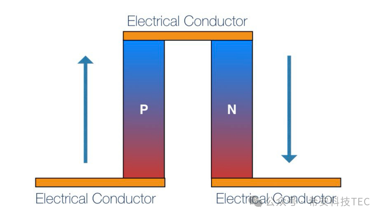 Der PN-Übergang bildet durch die leitende Schicht ein Thermoelement und ist die zentrale Strukturkomponente von TEC. Ein einzelnes Thermoelementpaar kann nach dem Einschalten auch die Funktionen Kühlen oder Heizen übernehmen.