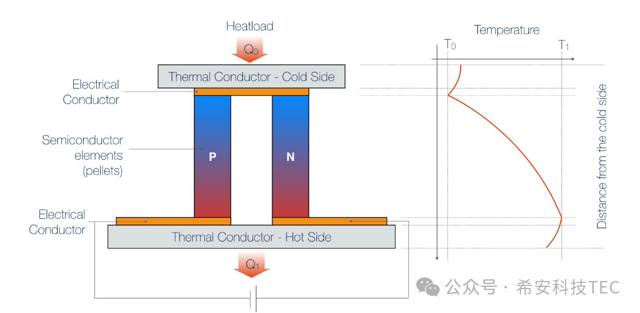 Am kalten Ende springen die Träger von einem niedrigeren Energieniveau auf ein höheres. Beim Übergangsprozess des Energieniveaus wird Wärme absorbiert und so ein Kühleffekt erzielt. Wenn sich die Träger am heißen Ende rekombinieren, wird unterdessen Energie freigesetzt, was zu einem exothermen Phänomen führt. Wird Gleichstrom in die entgegengesetzte Richtung geleitet, wird der Kühleffekt in Wärme umgewandelt.