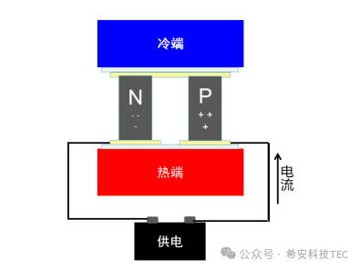Das Prinzip der Halbleiterkühlung (Peltier-Effekt) : Wenn Strom durch die Kontaktfläche zwischen p-Typ- und n-Typ-Halbleitermaterialien fließt, wandern die Ladungsträger und absorbieren Wärme, um eine Kühlung zu erreichen (kaltes Ende), während auf der anderen Seite Wärme abgegeben wird (heißes Ende).